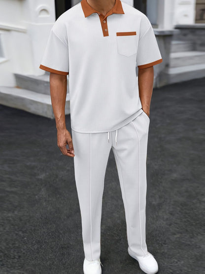 Men's Full Size Waffle-Knit Contrast Polo and Pants Set Plus Size